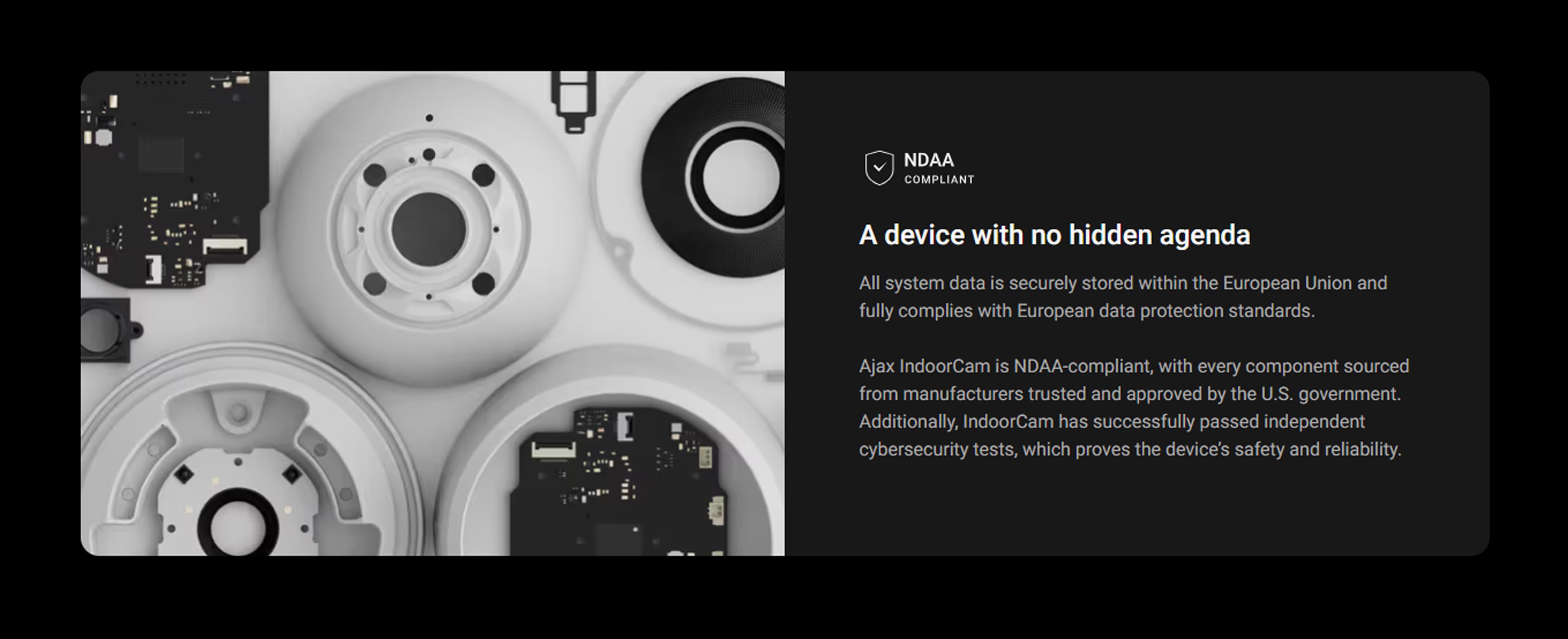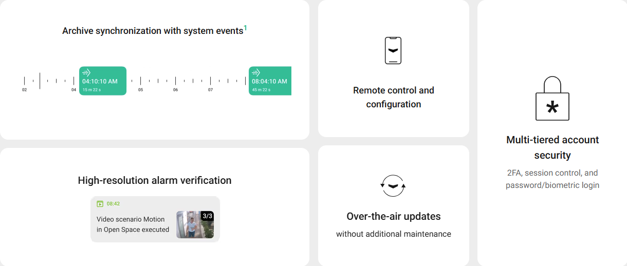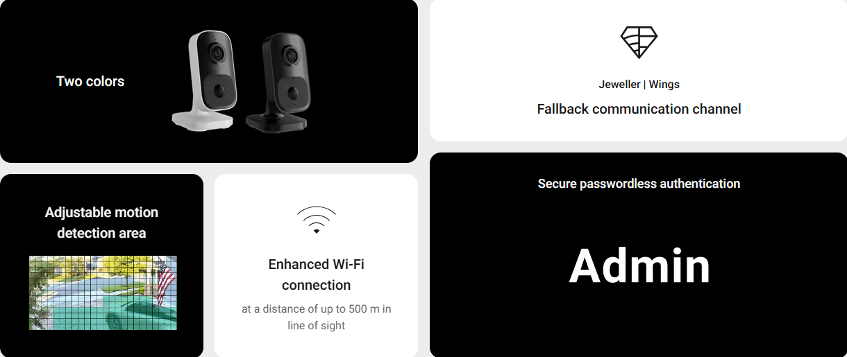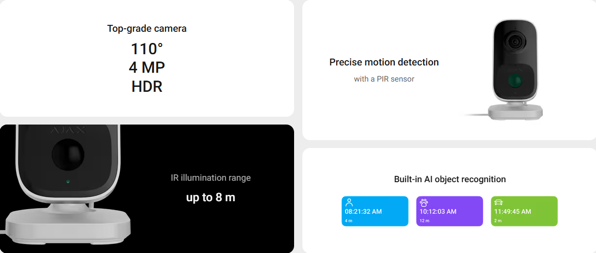 IndoorCam combines the convenience of Wi-Fi cameras with high-end security features. Its fallback communication channel with an Ajax hub ensures that the facility never drops out of sight, even if Wi-Fi is lost. Equipped with a PIR sensor and built-in AI, the device accurately detects movement and recognizes people, animals, and vehicles. Users can always get a clear view of indoor activity in outstanding quality thanks to the IndoorCam’s wide-angle HDR camera.
