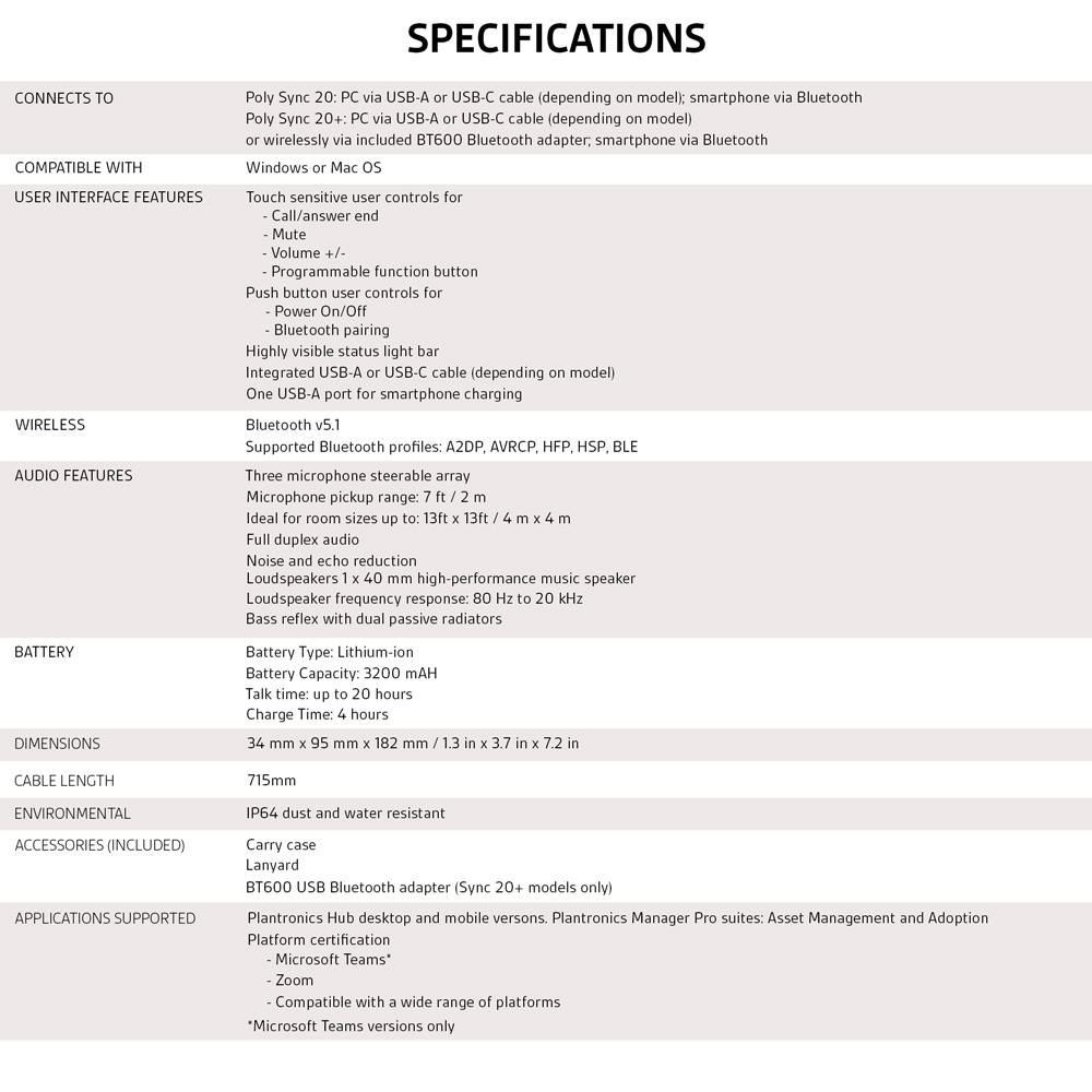 - Bluetooth USB Adapter ( Poly Sync 20+ only )